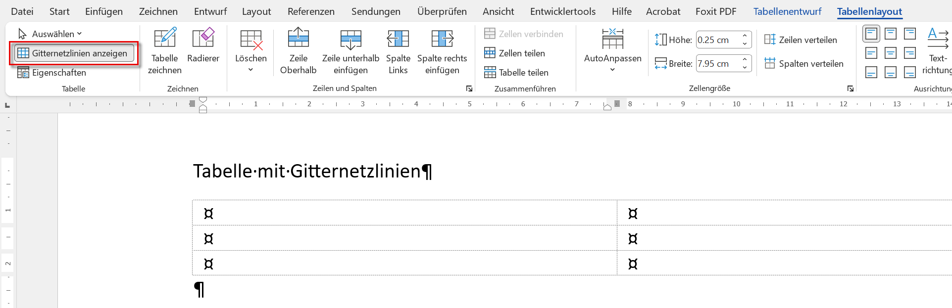 Die gute Nachricht: In Microsoft Word kannst du dir beim Bearbeiten dezente Hilfslinien anzeigen lassen. Diese sogenannten Gitternetzlinien helfen dir, jede Zelle klar zu erkennen – ohne dass später Rahmen im Dokument oder Ausdruck erscheinen.